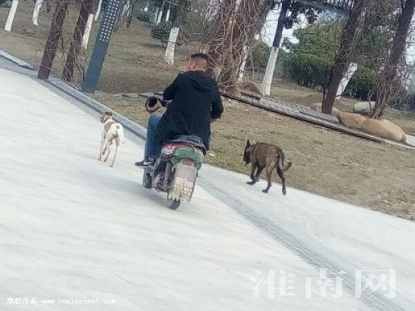在高新區(qū)中央公園一處寫有“嚴(yán)禁摩托車駛?cè)雸@區(qū),禁止攜帶寵物進(jìn)入公園”的標(biāo)識(shí)牌附近,一名中年男子竟然騎著摩托車,帶著兩條大狗在園區(qū)內(nèi)肆意奔跑。當(dāng)園區(qū)管理人員上前勸阻時(shí),男子置若罔聞,仍在園區(qū)內(nèi)遛狗。(記者)