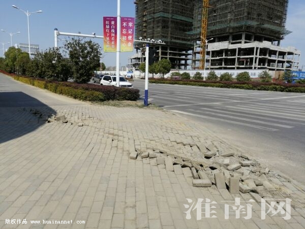 在春申大街與淮河大道交叉口西南角,有一段鋪設(shè)的地磚被車輛碾壓后,遭到嚴(yán)重破壞。不少地磚被壓斷、散開或翹起(如圖),影響到正常通行。(記者)