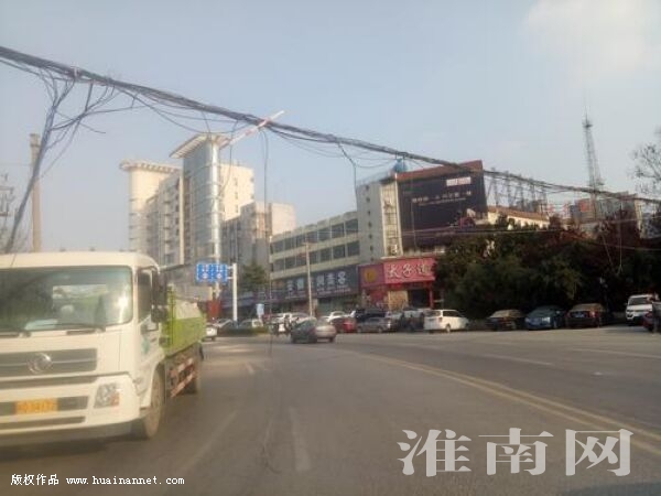 近日,淮河早報、淮南網(wǎng)記者途經(jīng)舜耕路火車站附近時,看到有一段電線橫穿在路面上空,雜亂地交織在一起,還有幾段電線掉下,垂落在路中間,存在安全隱患。(記者)