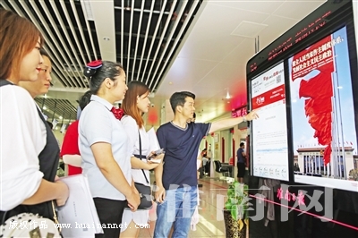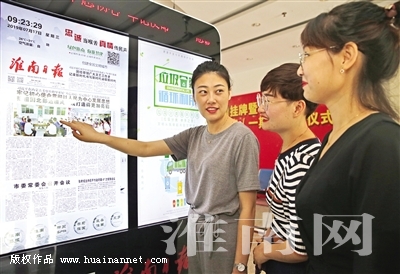 當(dāng)日上午,在市政務(wù)服務(wù)大廳,前來辦理事務(wù)的市民王先生,意外發(fā)現(xiàn)大廳里多了一臺(tái)外觀新穎的大型電子閱報(bào)屏!巴ㄟ^手指觸屏、滑動(dòng),我翻閱了當(dāng)天的淮南日?qǐng)?bào)、淮河早報(bào),瀏覽了淮南網(wǎng),點(diǎn)擊了‘學(xué)習(xí)強(qiáng)國(guó)’,還觀看了展示淮南旅游風(fēng)光、美好形象、厚重歷史以及經(jīng)濟(jì)社會(huì)民生環(huán)境發(fā)展的短視頻?煽础⒖陕、可讀,圖、文并茂,聲、音并重,多維呈現(xiàn)。我很喜歡這種閱讀形式!”王先生告訴記者。