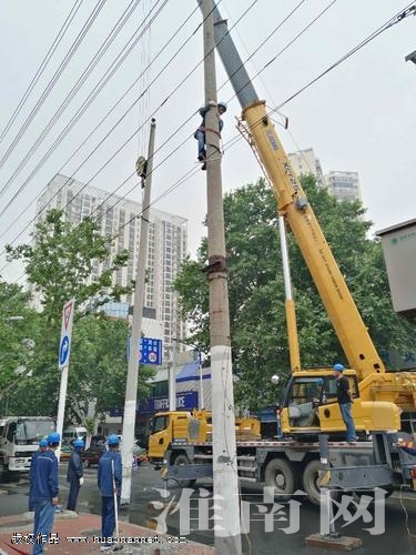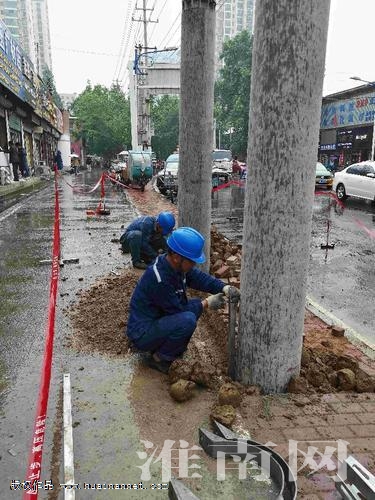 5月14日上午,淮河早報(bào)、淮南網(wǎng)記者來(lái)到人民北路對(duì)線桿遷移工程進(jìn)行了探訪。在人民北路與國(guó)慶路交叉口東北側(cè),一處占道的高大線桿被藍(lán)色圍擋圍起,基底被挖開(kāi),準(zhǔn)備拆除,而一旁豎立著一根新安裝的電線桿。在人民北路東側(cè)的交警一大隊(duì)公交站前也豎立著兩根電線桿,一直影響公交車進(jìn)站?浚缃襁@兩根電線桿上分別用紅色標(biāo)出大大的“拆”字。在人民北路與湖濱路(香港街)交叉路口,不論是高空,還是地面,也都是一派忙碌的場(chǎng)景;春釉鐖(bào)、淮南網(wǎng)記者看到,施工人員正按分工緊張而又有序進(jìn)行著線桿遷移工作。雖然當(dāng)天上午雨時(shí)停時(shí)下,時(shí)大時(shí)小,但施工人員依然正常進(jìn)行工作。