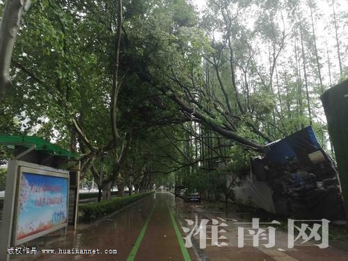 (記者 張明星)從6月27日晚以來,淮南下起了暴雨。受暴雨影響,在洞山中路南側老龍眼公交站旁,出現幾棵大樹傾倒的情況。