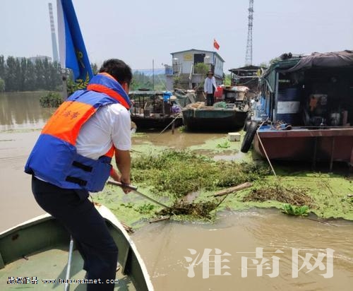 圖二:7月25日下午2時(shí)30分,市海事局水上行政執(zhí)法稽查大隊(duì)防汛值班人員接到船員高頻求助,在稽查大隊(duì)工作躉船上游150米處有幾條生活船被雜草纏繞,并有幾條水蛇出沒,而船上只留一女子值守,無法自行清除雜草,海事防汛值班人員立即趕到現(xiàn)場(chǎng)水域,幫忙清除雜草和水蛇,排除安全隱患。