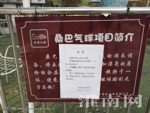 圖二:龍湖公園游樂(lè)活動(dòng)區(qū)張貼的公告。(記者 王玲 張明星)