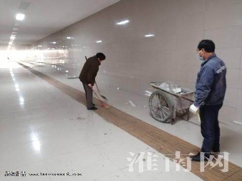 11月30日,淮河早報、淮南網(wǎng)記者再次來到淮南火車站地下人行通道探訪,看到有3名施工人員正在現(xiàn)場進行維護,對地面衛(wèi)生進行清掃。據(jù)其中一位代姓施工人員介紹,他們于11月24日和25日兩天已對淮南火車站地下人行通道衛(wèi)生進行了清理打掃,30日這天對通道內(nèi)部分瓷磚進行維護,并對地面衛(wèi)生進行清掃。該代姓施工人員表示,他們以后將每隔兩天對該通道內(nèi)衛(wèi)生打掃一次。