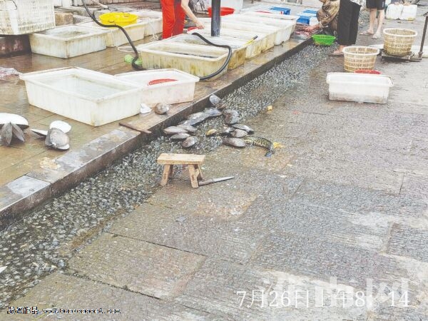菜市場(chǎng)的水產(chǎn)區(qū)域在小街西邊,這里有好幾家賣水產(chǎn)的門店。當(dāng)天上午,淮河早報(bào)、淮南網(wǎng)記者一路走來看到,這些店家把裝有水產(chǎn)的盆放在店門口,一些死魚、河蚌則直接放在地上。當(dāng)有居民挑選到合適的水產(chǎn),老板當(dāng)即沿街宰殺,血水、魚鱗弄得哪都是。沿街有一條五六十厘米寬的窄道,因?yàn)殚L(zhǎng)時(shí)間被水浸泡已變成了深綠色;春釉鐖(bào)、淮南網(wǎng)記者采訪過程中,看到一運(yùn)輸水產(chǎn)的車輛直接將水傾倒在地上,瞬間讓干凈的路面變得濕漉漉的。