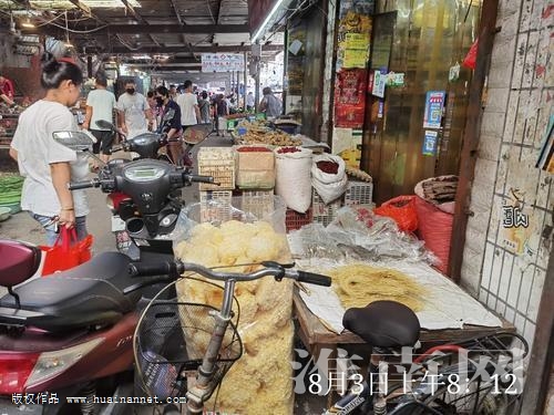 一進欣雅菜市場就能看到市場內(nèi)兩邊攤位都有出攤經(jīng)營情況,每個攤位前都會有用菜筐堆起的另類攤位,菜筐上放著各種各樣的菜,這種現(xiàn)象到菜市場中段基本消失,取而代之的是干貨鋪把各種各樣的干貨擺在了店外,占據(jù)了市場內(nèi)的一片地方。