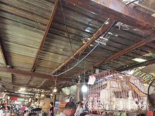 而在水產(chǎn)旁邊還有活禽區(qū),活禽區(qū)大多數(shù)都是圈禽售賣,偶爾有一兩家把鴨子散放在地上,或是把一兩只雞單獨拴在籠子頂部;钋輩^(qū)最亂的是頂棚掛滿了蛛網(wǎng)和灰塵,和其它攤位的頂棚比起來明顯臟了很多。