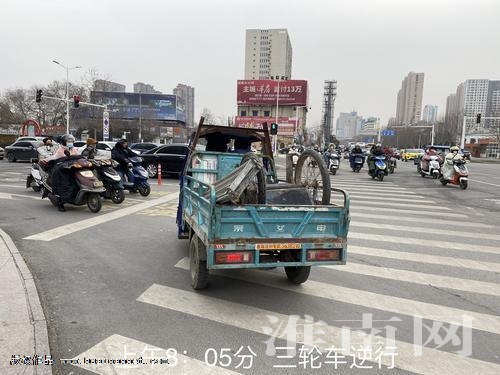 8時(shí)05分,一名男子由南向北,在機(jī)動(dòng)車道上騎電動(dòng)三輪車。對(duì)已經(jīng)亮起的紅燈熟視無睹,加速行駛。