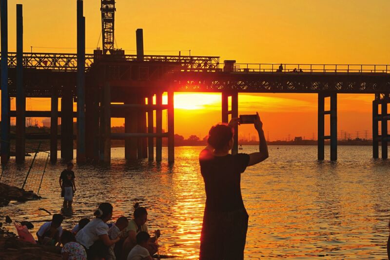 盛夏的淮南,暑氣未消,淮河之濱,夕陽與建設(shè)中的新橋交織出別樣景致,引得眾多市民前來駐足。