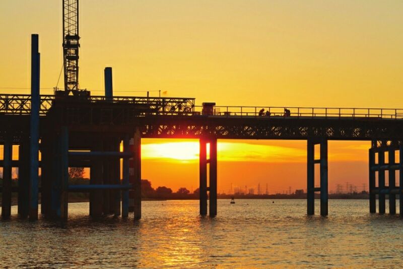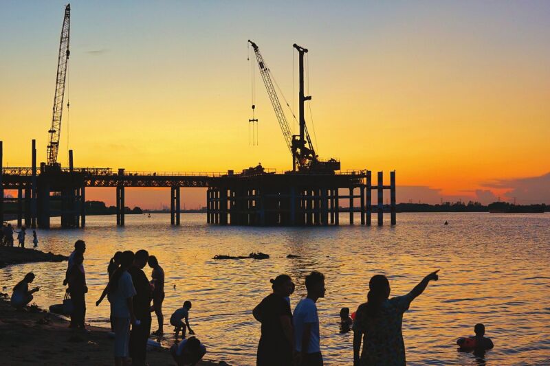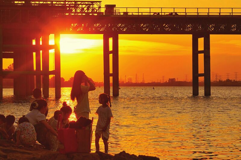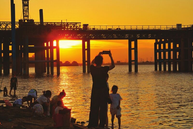 7月的傍晚,夕陽的余暉傾瀉在淮河水域,粼粼波光如碎金般在水面跳躍。在淮南淮河大橋建設(shè)工地旁,不少市民或攜家?guī)Э、或呼朋引伴來到這里,他們有的赤腳立于淺灘,感受河水的清涼;有的靜靜佇立,眺望落日與新橋相映成趣的畫面。