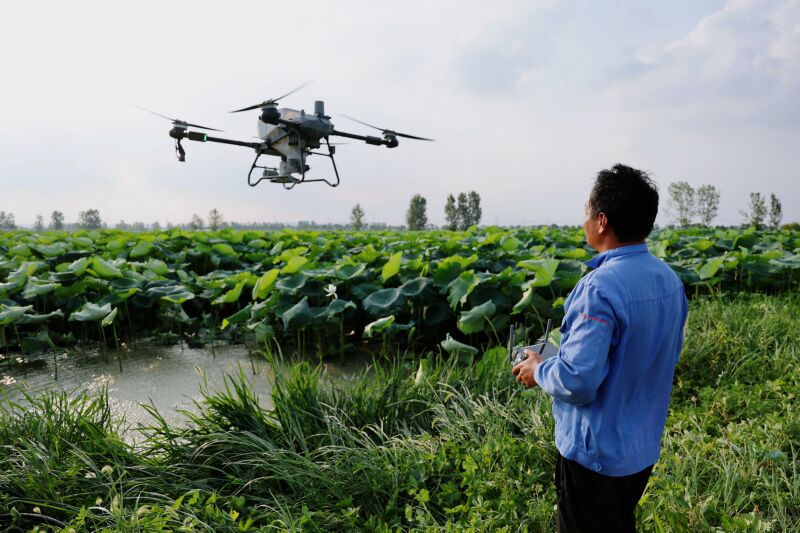 大通區(qū)孔店鄉(xiāng)因地制宜,利用地勢和水系特性,引導(dǎo)農(nóng)民種植蓮藕、芡實等經(jīng)濟作物,今年栽種的5000多畝蓮藕長勢喜人。圖為該鄉(xiāng)蔡城塘東岸的農(nóng)民用植保無人機防治荷塘病蟲害。