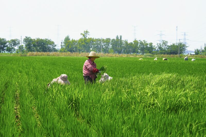 當(dāng)前正值水稻生長旺季,安徽農(nóng)墾淮南農(nóng)場持續(xù)聘請人工除草隊對良種水稻進行除草作業(yè),消除稗草等有害雜草,有效避免了藥劑使用,保障水稻品質(zhì),促進生態(tài)環(huán)保。