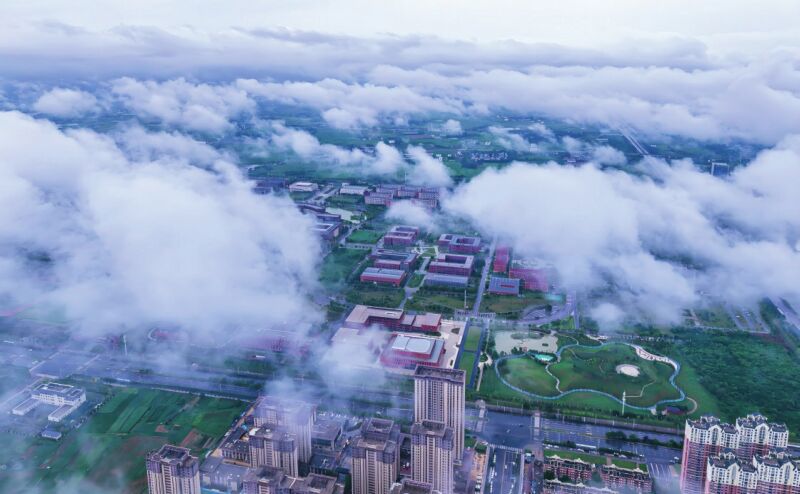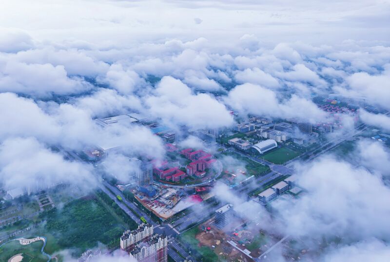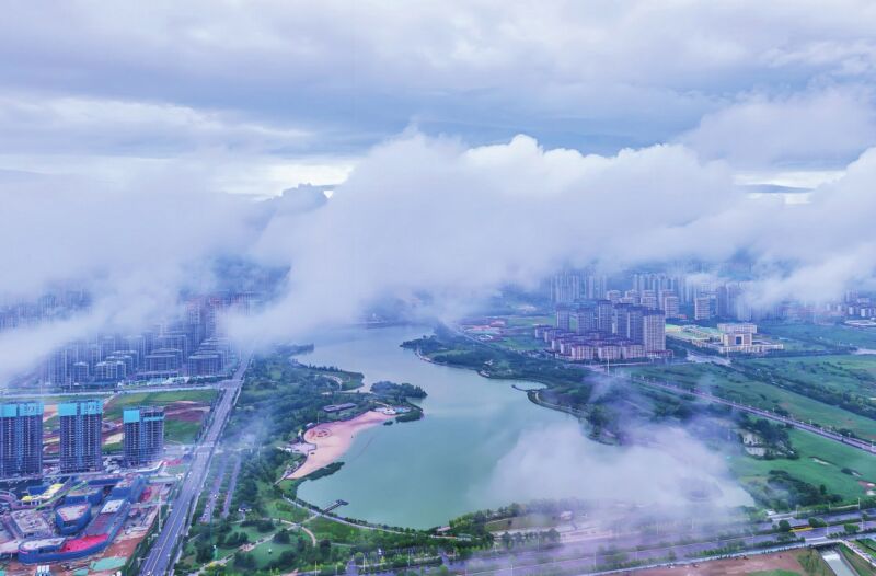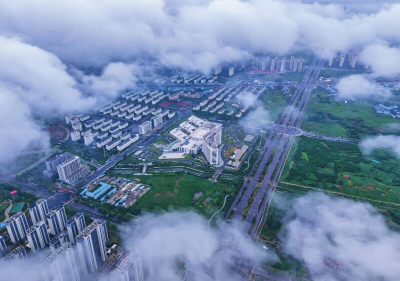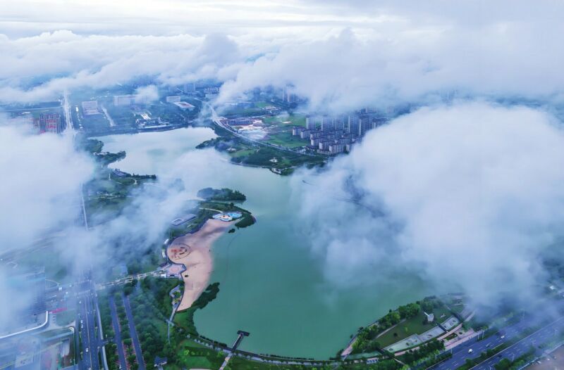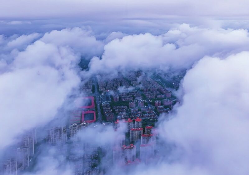 薄霧與云靄交融,如絹如紗般輕盈漫過整座城市,宛如一幅水墨畫卷。雨霧氤氳中,朦朧水汽里,這座城市褪去了平日的喧囂,樓宇、街道在朦朧雨幕中若隱若現(xiàn),盡顯別樣的靜謐與溫柔,雨中淮南的朦朧之美與生機(jī)活力,在云端悄然綻放。