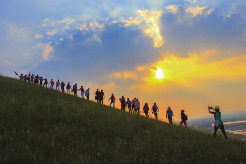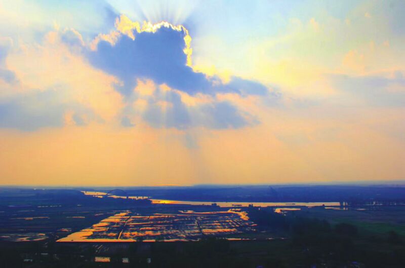 八公山由大小四十余座山峰疊嶂而成,方圓達(dá)二百余平方公里,主峰海拔241.2米,歷史文化內(nèi)涵深厚,自然條件優(yōu)越,1987年被省人民政府命名為省級(jí)風(fēng)景名勝區(qū)。近日,一群登山愛好者來到壽縣至鳳臺(tái)淮河段,攀登硤山口一座山峰。他們登上山頂極目遠(yuǎn)眺,淮水滔滔,平原遼闊,天邊金光刺破云幔,流霞漫天,山河在暮色中化作一幅鎏金長卷。