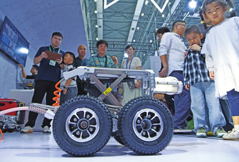 圖一:9月20日,2025世界制造業(yè)大會(huì)現(xiàn)場(chǎng),觀眾觀看淮南和億德科技有限公司管道檢測(cè)機(jī)器人演示。
