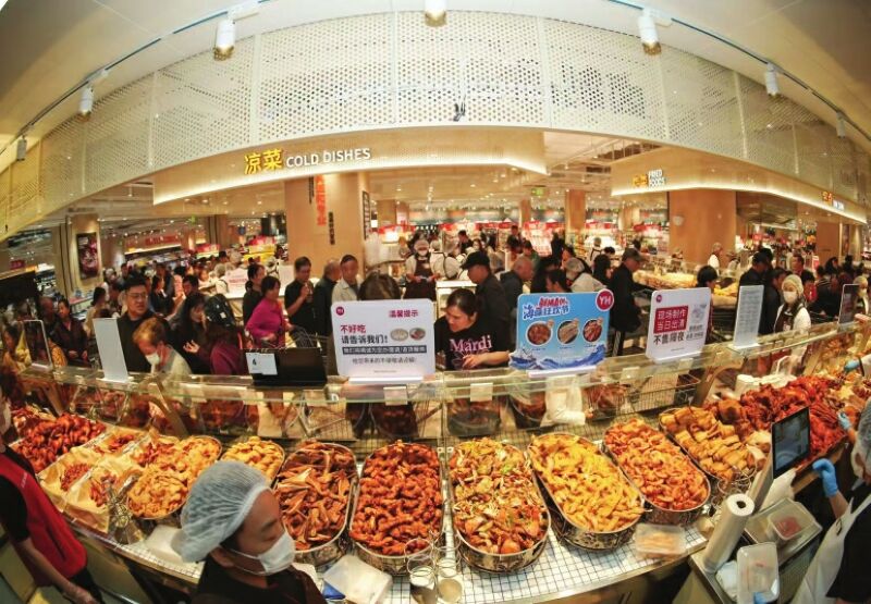 在商品供給上,門店全方位升級。生鮮區(qū)引入蕓嶺有機(jī)蔬菜、永輝定向種植的貝貝南瓜,以及應(yīng)季的小青檸檬、大荔冬棗等;肉禽海產(chǎn)區(qū)匯聚農(nóng)夫好牛牛腩塊、無抗雞、澳洲進(jìn)口牛肉,還有梭子蟹、皮皮蝦等時令海味直送門店;熟食區(qū)融合全國風(fēng)味與本地特色,既有椒鹽皮皮蝦、撈汁小海鮮,也有蕪湖紅皮鴨、鹵鵝;烘焙區(qū)的榴蓮千層等高顏值產(chǎn)品備受青睞;食百類則提升進(jìn)口商品占比,設(shè)立魔童專區(qū),還引入近60支胖東來自有品牌商品及130余支永輝自有品牌商品。