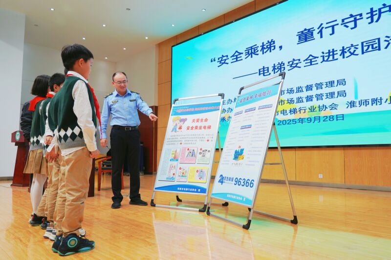 9月28日下午,市市場監(jiān)督管理局、淮南高新區(qū)市場監(jiān)督管理局聯(lián)合市電梯行業(yè)協(xié)會,在淮師附小山南校區(qū)舉行“安全乘梯,童行守護——電梯安全知識進校園”活動,向學生們詳細講解了垂直電梯和自動扶梯的安全規(guī)則、常見危險行為及故障應對方法。