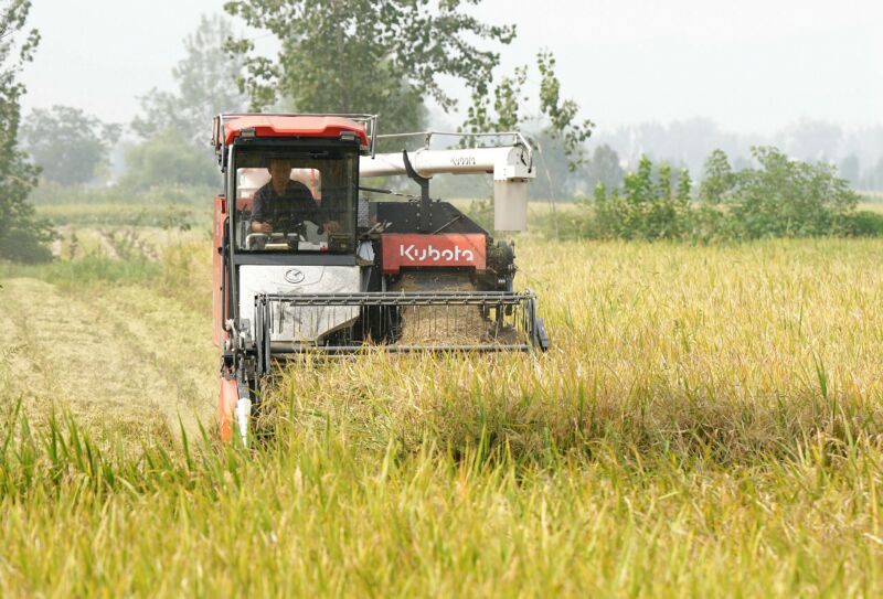 10月12日,潘集區(qū)平圩鎮(zhèn)農(nóng)民駕駛農(nóng)機(jī)在地里收割水稻。(記者 蘇國義 攝)
