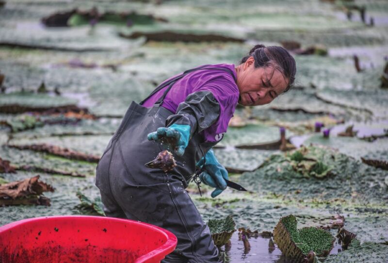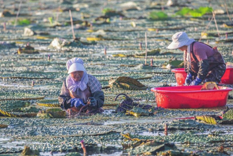 金秋時節(jié),大通區(qū)王樓村的百畝芡實迎來采收季。村民們彎腰俯身,熟練地采摘著渾圓飽滿的芡實果實,水面映著忙碌的身影,一派豐收景象。
