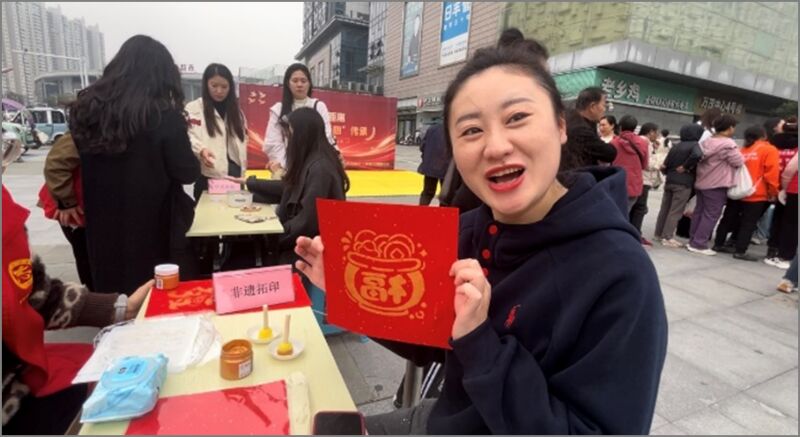 活動現(xiàn)場分為文化展演與趣味互動兩大板塊,傳統(tǒng)武術(shù)與現(xiàn)代舞蹈輪番上演,博得陣陣掌聲;最受歡迎的還是投壺、非遺拓印、非遺漆扇和中式串珠四大體驗區(qū)。市民秦女士高興地說:“買菜正好路過這里,有幸參與了活動,親身體驗了一下做漆扇和串珠,收獲很大!”