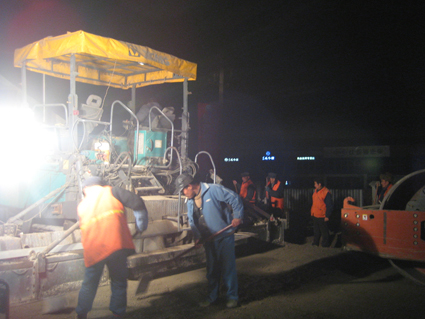 2009年12月29日晚8時左右,記者跟隨市建委工作人員驅車來到淮南市東西部第二通道山王至鳳臺段沿線施工工地進行采訪,途中,記者不時見到一輛輛運載泥土的大貨車來回奔馳,一派施工繁忙的景象。記者在鳳臺段一處施工工地看到,五六盞白熾燈照射下,2臺車輪直徑1米多的攤鋪車正在緊張有序地施工。這里正在進行的是水穩(wěn)攤鋪工作。幾乎同時,一群施工人員從對面昏暗的燈光中迎著記者走了過來。一看,都是記者曾經在有關東西部第二通道采訪中多次接觸過的負責工程建設的老面孔。據東西部第二通道三工區(qū)項目負責人賈云東介紹,當晚,在東西部第二通道山王至鳳臺段施工工地上,共有10余臺機械、100余名工人在加班加點地工作。