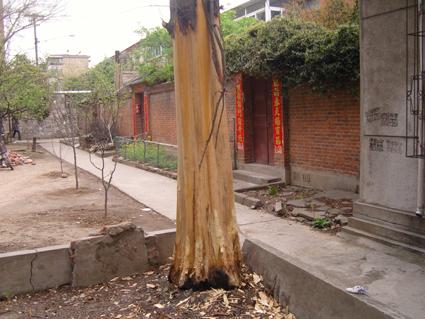 記者隨即趕到了廣場南路,在基建村35號樓的南面,記者看到了這棵被剝皮的水杉樹,該樹高約20米,直徑約50公分。樹枝上發(fā)出大量嫩綠的樹葉,但是從地面到枝椏近3米的樹干上的樹皮已經(jīng)被人剝?nèi)チ,樹的根部有明顯被火燒過的痕跡,樹干上到處都是被刀砍的痕跡。