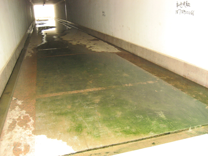 記者首先來到陳洞南路地下立交橋。走進立交橋內,記者看到立交橋下的通道上仍然存在大面積的積水(如圖一),積水深度大約在3厘米左右。記者試圖從積水路面走過,但沒走幾步,積水便將記者的鞋子浸透。由于長期積水的原因,導致立交橋下的通道上布滿了綠苔。記者發(fā)現(xiàn)通道中間的積水要比兩端的深,也就是說這條通道在修建時可能存在這樣的問題:兩邊高中間低,因而形成了下水不暢的問題。