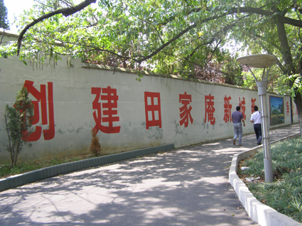 在淮南市博物館西側的文化廣場游園,新鋪就的瀝青道路、書寫迎接省運會標語的白色墻面,都為這個游園增色不少。但美中不足的是,有人在游園里種上了蔬菜,樹上也懸掛著不少雜物,現(xiàn)場顯得有些臟亂。