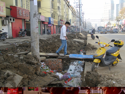 記者接報后立即趕到舜耕小街了解情況。在位于舜耕小街的南側(cè),一條排水溝已被開挖,從人民路延伸到龍湖路,貫穿整條舜耕小街,將道路和南側(cè)居民區(qū)隔開。記者在現(xiàn)場發(fā)現(xiàn),這條排水溝寬度約一米多,深淺不一,有些地方已經(jīng)積水。市民為了方便出行,在排水溝的一些地方回填了泥土,有些地方,市民干脆將門板、桌面等廢舊木材架設(shè)在排水溝上,形成了一座座臨時的小橋。