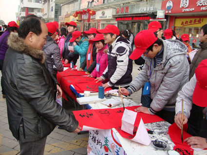1月29日下午,雖然寒冷的冬風(fēng)刮得人不愿出門,但家樂福時(shí)代廣場門前卻人頭攢動(dòng)、暖意融融。原來,淮南一中的30多位學(xué)生為了讓校內(nèi)的貧困生能在開學(xué)有新的學(xué)習(xí)用具,而專門在這里組織了一場義賣春聯(lián)的愛心籌款活動(dòng)。