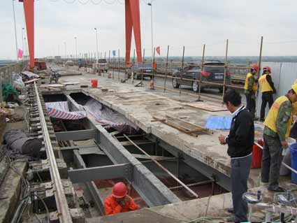 據(jù)了解,此次維修的亮點(diǎn)之一,就是公路橋面用鋼筋混凝土組合結(jié)構(gòu)代替了原來(lái)的鋼筋混凝土,這種組合結(jié)構(gòu)將解決從公路橋面向下層鐵路橋面掉落螺絲釘、螺帽、石子等雜物的問(wèn)題;此外,這種組合結(jié)構(gòu)的受力可均勻分布,因而承重能力更好,在理想狀態(tài)下,設(shè)計(jì)壽命可達(dá)幾十年。公路路面采用薄層瀝青混凝土路面,厚度只有4公分,比原來(lái)的路面更薄,“路面并非越厚越好”,現(xiàn)場(chǎng)施工負(fù)責(zé)人告訴記者,這種薄層瀝青混凝土路面是一種新工藝,它的耐磨性要好于以前。此外,此次大橋維修也更換了原有的伸縮縫,伸縮縫位于大橋混凝土面板之間,起到連接、減震等作用。而原有的伸縮縫存在的缺陷在于,只能允許橋面板之間前后錯(cuò)位。新使用的伸縮縫,采用了新工藝,屬于國(guó)際專利產(chǎn)品,可以承受橋面板上下、左右、前后三個(gè)方向的錯(cuò)位,因而連接、減震等作用更好。