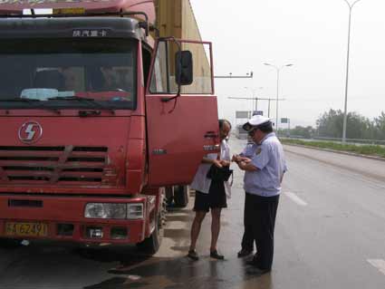 圖:聯(lián)合稽查人員在206國道上窯段對過往貨車進行排查。