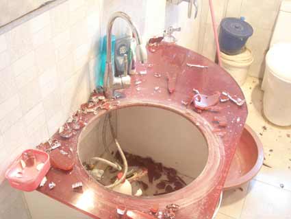 據蘇女士稱,前一天下午3點多鐘,她和老公在樓下干活,就聽“砰”的一聲響,當時蘇女士覺得可能是后面樓房收廢品的在扔東西,也就沒在意,可沒過多久,她就聽見其妹妹呼喊著跑下來說她家衛(wèi)生間的洗臉盆炸了。蘇女士連忙上樓,看到滿屋的凌亂,到處的玻璃碎片。而最讓蘇女士感到后怕的是,10分鐘前,她才把1歲多的兒子從衛(wèi)生間送到臥室,如果遲個幾分鐘,后果不堪設想。