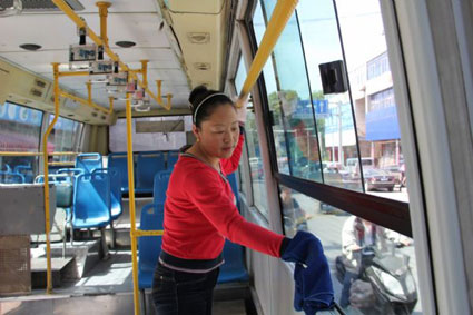 圖:每次車輛到達(dá)終點(diǎn)站,黃傳霞都會(huì)利用短暫的休息時(shí)間清潔車內(nèi)衛(wèi)生。