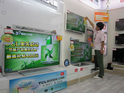 圖:一臺(tái)彩電上顯示著節(jié)能補(bǔ)貼政策