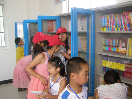 圖二:孩子們在留守兒童活動室的書柜中尋找自己喜愛的圖書。