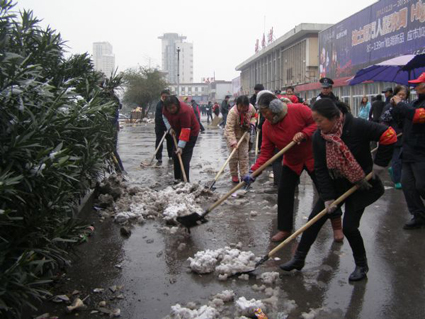 圖:30多名城管志愿者和城管執(zhí)法隊員來到火車站廣場鏟除積雪。