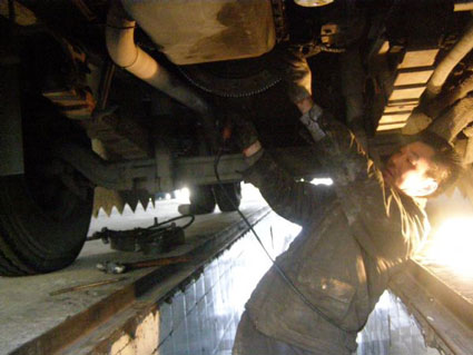 圖為淮南中北巴士公司三車隊(duì)技術(shù)人員鉆入車底檢修公交車底盤。