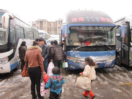 據(jù)介紹,淮南長途汽車站發(fā)車時間為早上5:30—下午5:30之間,由于19日受積雪影響,最早5:30的班車都向后推遲了約一個半小時,才允許發(fā)車。