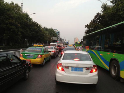 淮河大道北段與洞山中路交匯的十字路口,之所以會(huì)出現(xiàn)交通不暢的現(xiàn)象,究其原因有二:一是該路口與一座城市立交橋相連,二是此路口貫通四方,車流量較大,左拐右拐的車道、車輛較多。開出租車10多年的孫師傅稱,“以前私家車就是奢侈品,路面上根本看不到幾輛,那時(shí)道路真是干凈,開車真是爽呀,夸張點(diǎn)說不用踩剎車一路開到目的地。可現(xiàn)在這路堵的都不能走,高峰期時(shí)從上橋開始計(jì)算到下橋,最少?zèng)]個(gè)10分鐘都走不完,再碰到什么節(jié)假日,那更是堵得沒法看!痹谑聵I(yè)單位工作的王先生最怕上下班高峰,開著車到立交橋就開始頭疼,上了立交橋更是頭疼,因?yàn)橛休o路,很多車輛從輔路往立交橋上開,這樣原本已開到立交橋上的車輛和這些從輔路上開來的車輛匯在一起讓立交橋的負(fù)荷一下增大,再碰到一些不自覺的司機(jī),在車流中躥來躥去,更是影響交通!坝幸淮蜗掠晏,一輛直行車輛硬插入到右拐彎道中,因?yàn)闆]有提前打方向燈,后面的車輛沒反應(yīng)過來直接撞上了,兩輛車把兩條車道基本占滿,后面的車輛根本無法通過,而且兩人都各有各理,還要等保險(xiǎn)公司勘查現(xiàn)場(chǎng),結(jié)果我們就在立交橋上被堵了近半個(gè)小時(shí)!蓖跸壬f。