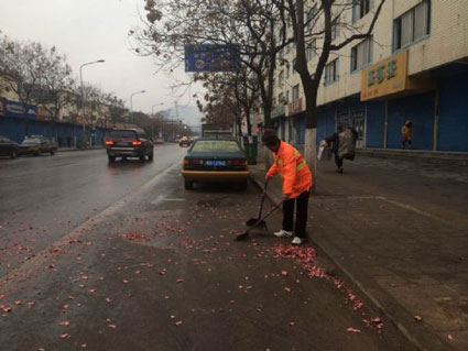 圖:清晨的學(xué)院南路上環(huán)衛(wèi)工人正在清掃鞭炮的紙屑。