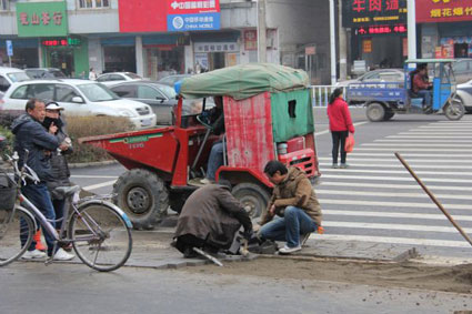 圖:施工人員正在給堵住斑馬線的綠化帶鋪設(shè)人行道磚