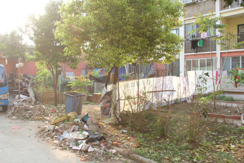 接到居民電話后,記者于4月14日下午來到龍興園小區(qū)。剛進小區(qū)大門,記者就看到小區(qū)內(nèi)的道路已經(jīng)多處破損。路邊的一個窨井蓋看上去已經(jīng)破碎很久,取而代之的是一個更為破舊的床板蓋在窨井上。再往里走,記者看到一堆堆的建筑垃圾堆放在道路邊和綠化帶內(nèi)。而所謂的綠化帶早已被“勤勞”的小區(qū)居民們開墾成了一塊塊菜地,種上了各種蔬菜和農(nóng)作物,有的居民還在綠化帶內(nèi)豎起了籬笆以保護自家的“菜地”,個別居民還在綠化帶內(nèi)使用五顏六色的破舊的廣告布當做圍欄。在小區(qū)4l號樓旁,有戶居民竟然加蓋起兩屋建筑,整個小區(qū)的綠化大部分已被破壞。