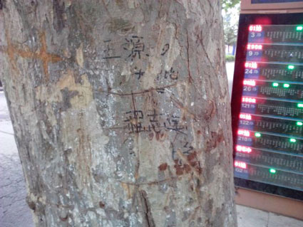 除了洞山中路,在洞山西路的淮南師范學院、淮南聯(lián)合大學及羅山加油站附近路段,記者同樣看到了此類現(xiàn)象。在一些路段,除了涂寫、刻劃外,行道樹還因被人故意敲打而留下了傷痕。