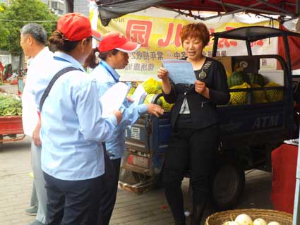 圖為:文明勸導(dǎo)員向瓜農(nóng)送發(fā)“西瓜地圖”和《一封信》。