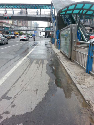 接到熱線后,當(dāng)天上午記者來(lái)到徐女士所反映的地點(diǎn),看到在位于人行天橋下東北角,有水不斷從一處寫有“首創(chuàng)水務(wù)”的井蓋下冒出,水流順著非機(jī)動(dòng)車道路面一直向東流淌,流到約有二十米外的下水道。水流經(jīng)過(guò)低洼路面還出現(xiàn)積水,經(jīng)過(guò)的非機(jī)動(dòng)車輛均繞開行駛。