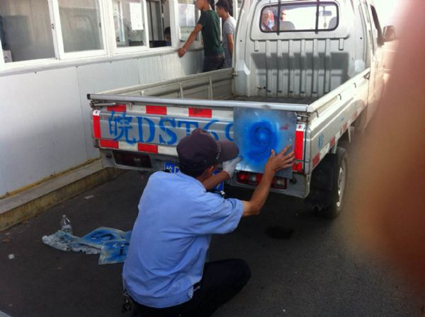 圖一:工作人員免費(fèi)對(duì)號(hào)牌不符標(biāo)準(zhǔn)車輛重新噴涂號(hào)牌