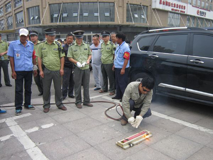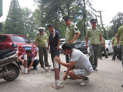 圖三:在泉山路口東北側(cè)廣場(chǎng),專業(yè)人員用工具清除設(shè)置在停車位上的停車鎖。