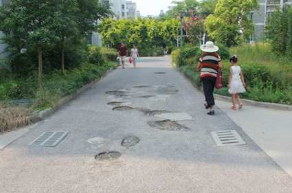 小區(qū)居民告訴記者:“我是2007年入住小區(qū)的,大概3年前道路就出現(xiàn)破損現(xiàn)象,應(yīng)該是鋪路的瀝青太少,導(dǎo)致石子脫落,雖然3年內(nèi)多次向物業(yè)反映,而物業(yè)也曾經(jīng)使用水泥等對(duì)破損地段進(jìn)行修補(bǔ),但是修補(bǔ)沒多久又會(huì)發(fā)生破損。如今道路破損越發(fā)嚴(yán)重,給小區(qū)居民出行帶來很大不便,前幾天還有人騎車在這里摔倒,所以希望物業(yè)能夠盡快把破損路面修復(fù)!